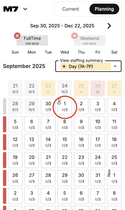 In the example circled below, this fraction tells you that 6 staff members have inputted preferences for this shift type on this day, and the target level for this shift type and day is 3.