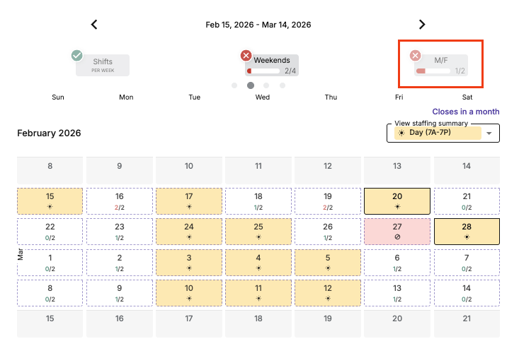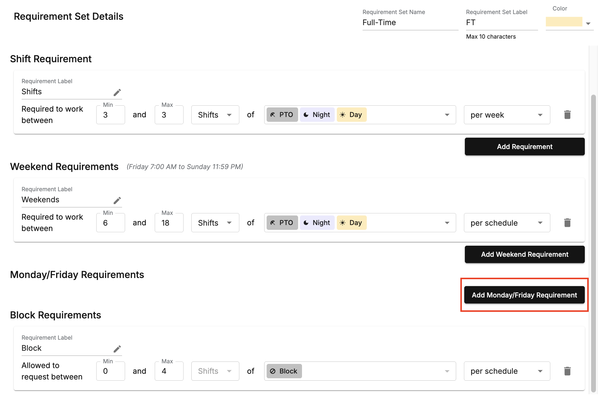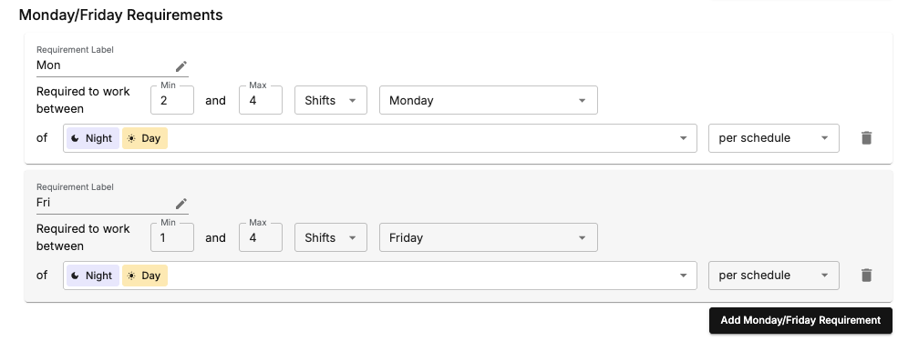 Step 3: Notice the ✨ new ✨ “Monday/Friday” option in the shift requirements.
