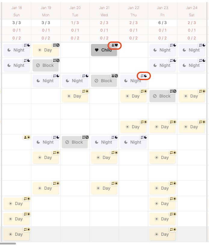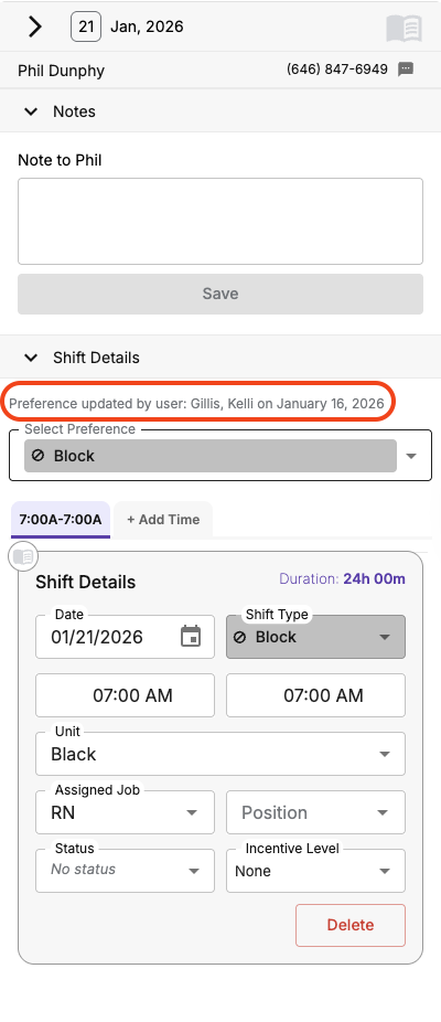 Step 3: Click on a shift tile and expand the right side panel to view how (user or template) and when (date) the preference was added.